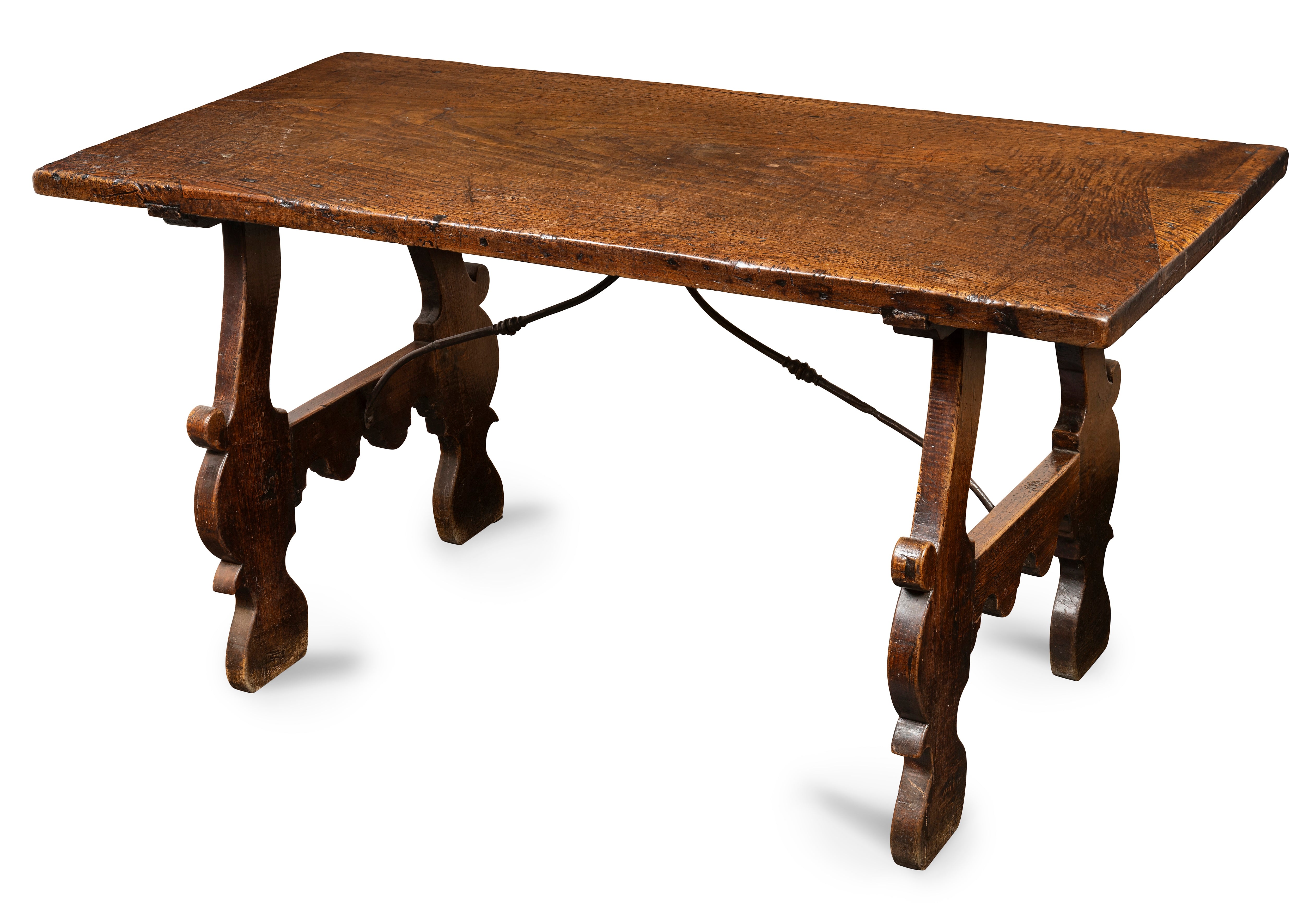 The chamfered rectangular single oak plank top raised above a pair of lyre form churresque walnut legs with scrolled wrought iron stretchers, a knuckle to the mid-point of each and rising to centre of the plank top.