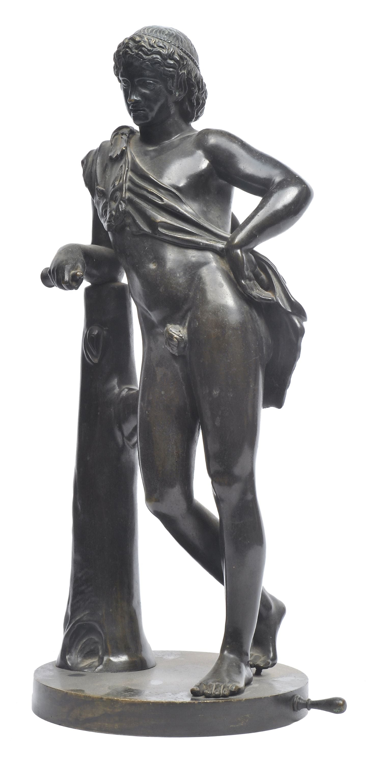 Adter the 2nd Century CE Roman marble Resting Satyr (Satyr anapauomenos) now housed in the Capitoline Museum, echoing the now lost 4th Century BCE original by Praxiteles, the figure in contrapposto with a pardalide slung over his shoulder, leaning on a tree trunk, raised on a circular base.